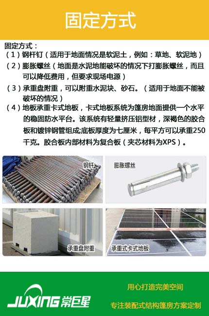 1. 膨脹螺絲:適用于地面是水泥平地且能破壞的情況;